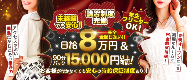 給与 | ★★★高収入が可能です!!★★★ ◆完全歩合制(50%以上)+指名料100%以上バック (日給 80,000円以上可能) 割引の場合でも基本料金からバックいたします! 【給料例】 (1日8時間勤務) 90分コース+王様オプション指名×1本=15,000円 90分コース+王様オプション×1本=13,000円 90分コース+王子オプション×1本=11,000円 120分コース+王様オプション×1本=15,000円 ⇒1日の給与合計…54,000円 (1日4時間勤務) 90分コース+王様オプション指名×1本=15,000円 120分コース+王様オプション×1本=15,000円 ⇒1日の給与合計…30,000円 ◆保証制度 1,200円/時間 の時給保証がありますのでお給料0円で帰ることはありません!ご安心ください!! ◆全額日払制 お仕事をした分は、その日のうちに全額現金でお支払いします!! ※ノルマ・雑費・罰金など、引かれるものは一切ありません! |