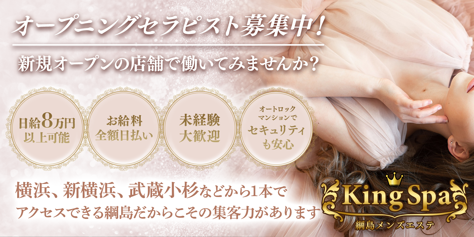 当店について | 当店は2023年6月30日にオープンした「綱島メンズエステ KingSpa」です。 新規オープンにつきセラピストさんを大量募集しています!複数ルームを同時にオープンすることでシフトに入れない、、、という心配はありません! ぜひお話だけでもできればと思います!! |